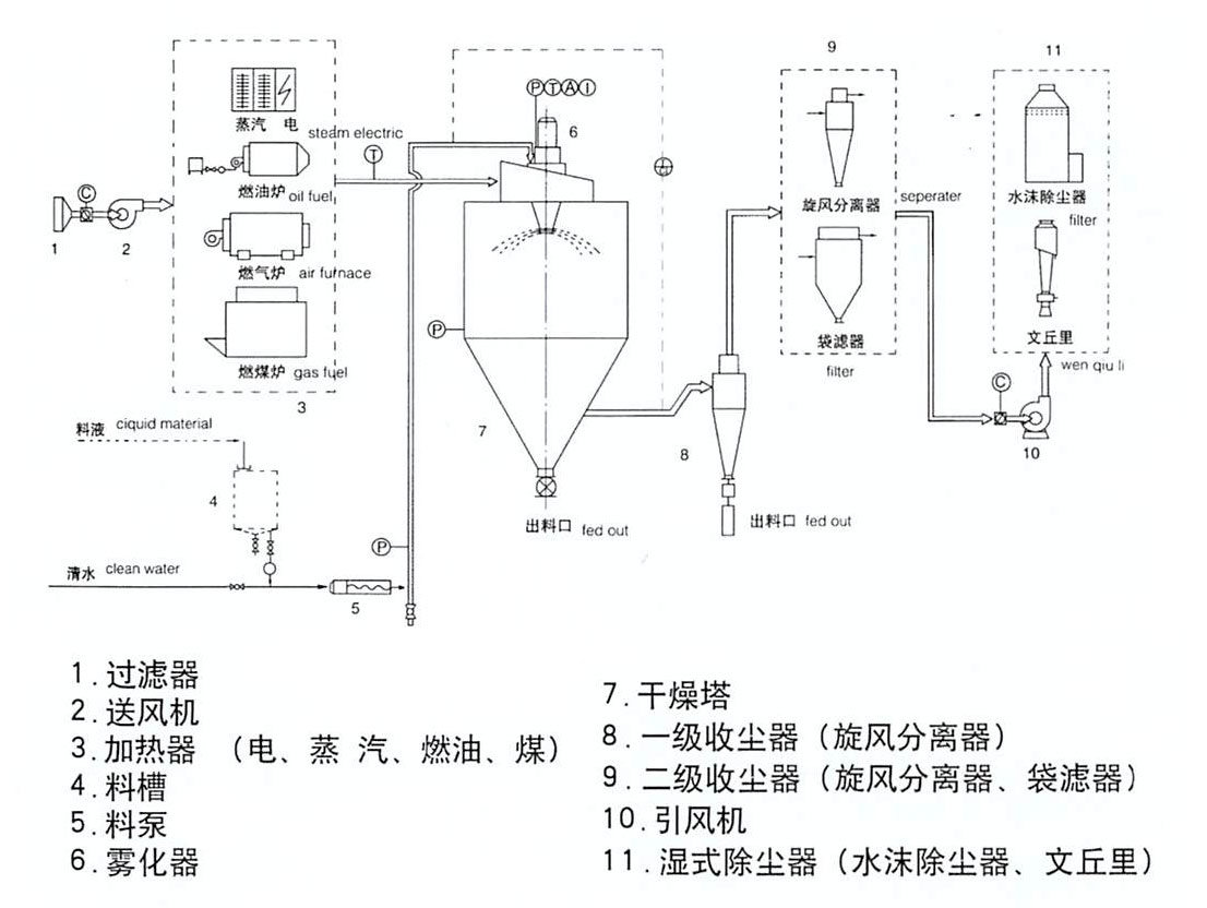 空氣通過過濾器和加熱器,進(jìn)入干燥塔頂部的空氣分配器,然后呈螺旋狀均勻進(jìn)入干燥室。料液由料液和熱空氣并流接觸,水份迅速蒸發(fā),在極短的時(shí)間內(nèi)干燥為成品。成品由干燥塔底部和旋風(fēng)分離器排出,廢氣由風(fēng)機(jī)排出。