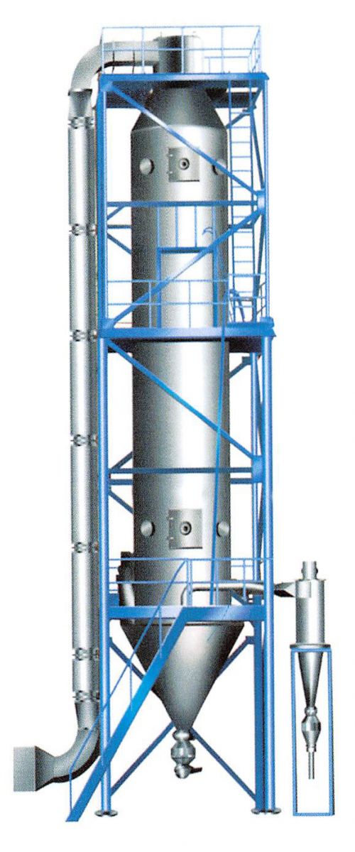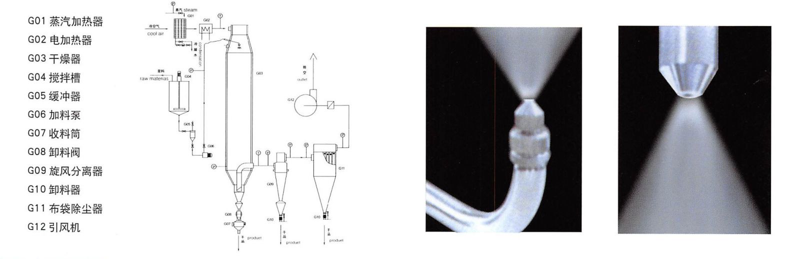 本機組工作過程中為:料液通過供料泵均勻輸入,噴出由壓縮空氣霧化成霧狀液滴,然后同熱空氣并流下降,大部分粉粒由塔底排料口收集,廢氣及其微小粉末經(jīng)旋風分離器分離,廢氣由排風機排出,粉末由設在旋風分離器下端的收粉筒收集,風機出口處還可裝備二級裝置,回收率在96-98%以上。