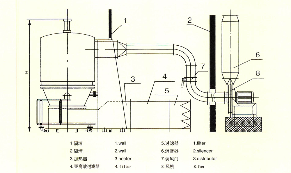 ※ 空氣經(jīng)加熱凈化后,由引風(fēng)機(jī)從下部導(dǎo)入,穿過料斗的孔網(wǎng)板,在工作室內(nèi),經(jīng)攪拌和負(fù)壓作用形成流態(tài)化,水份快速蒸發(fā)后隨著排氣帶走,物料快速干燥。